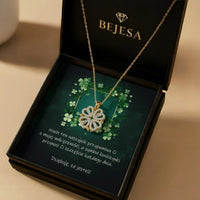 „Niech ten naszyjnik przypomina Ci o mojej wdzięczności, a symbol koniczynki przynosi Ci szczęście każdego dnia. Dziękuję, że jesteś!"