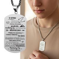 Ten nieśmiertelnik to więcej niż biżuteria. To rodzicielskie wsparcie, które syn będzie nosił na co dzień – niezależnie od tego, czy jest o dwa metry, czy dwa kraje dalej. Każda linia grawerunków mówi to, co czasami trudno wypowiedzieć na głos: "Podróż, bądź bezpieczny. Modlimy się. Kochamy Cię przez resztę naszego."